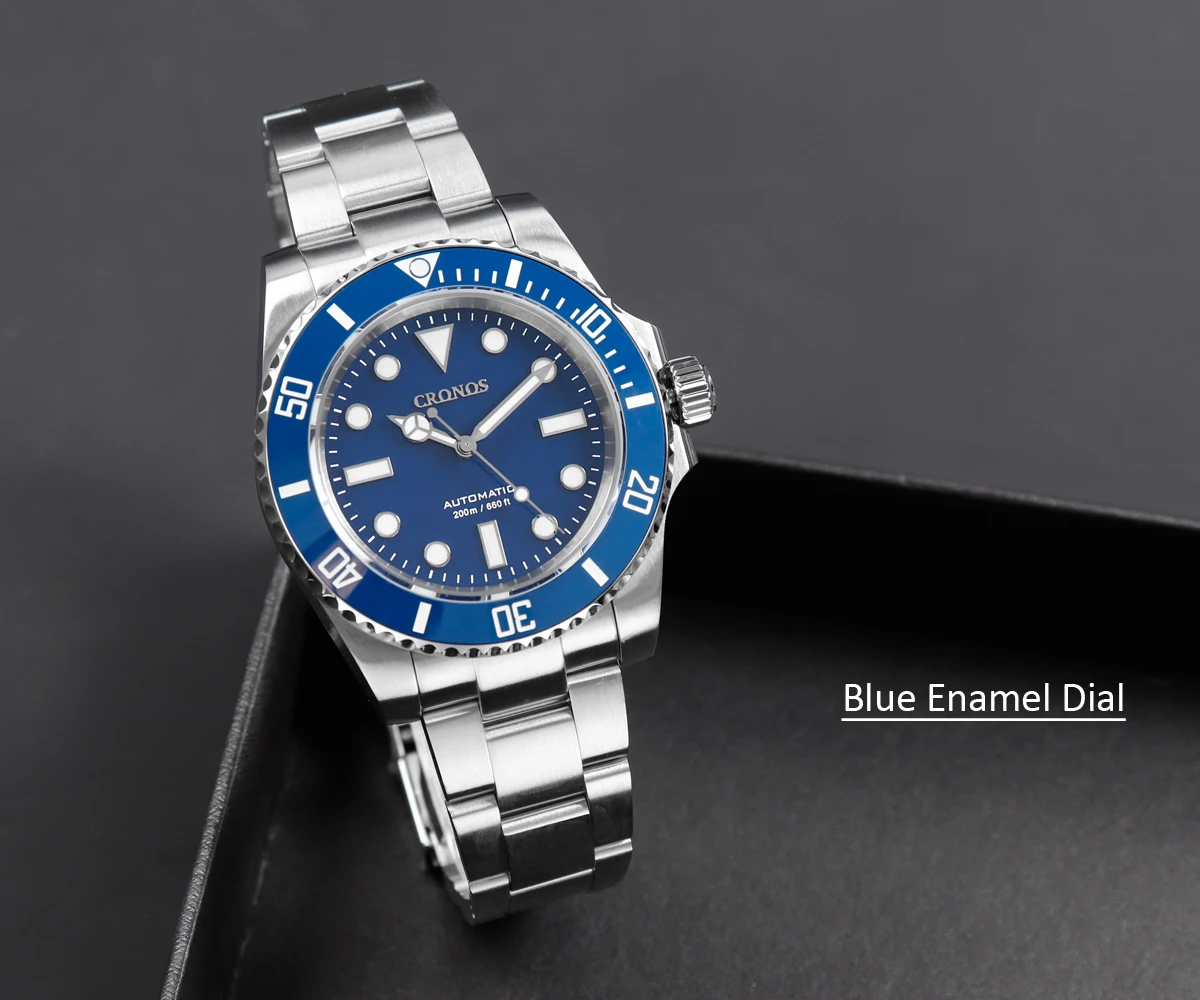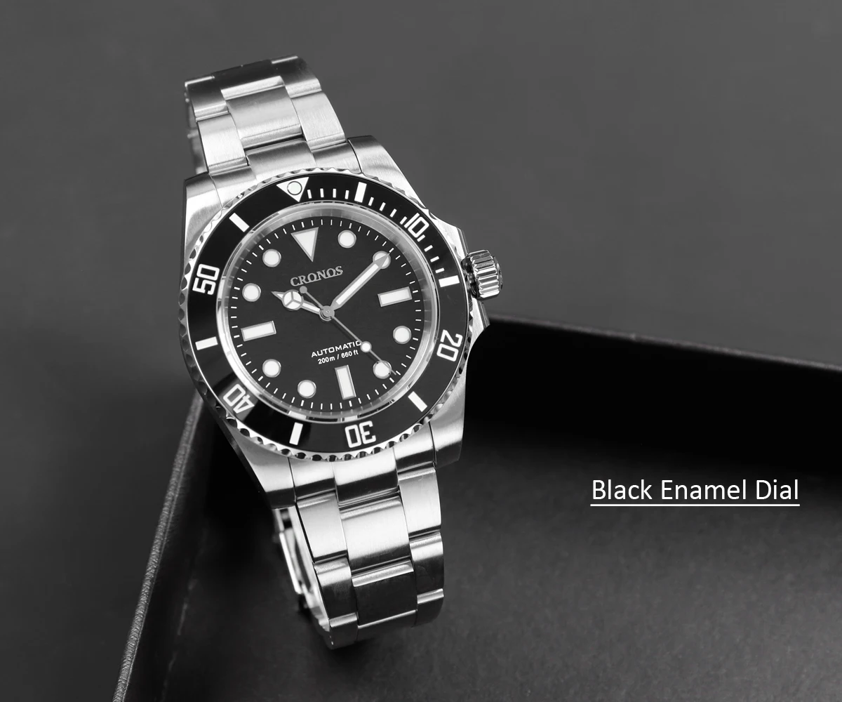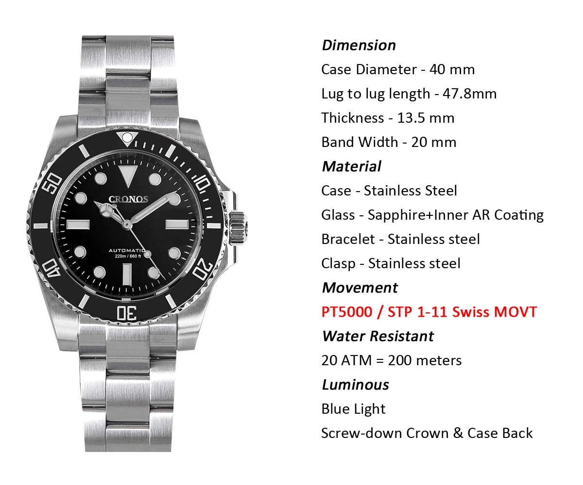 Cronos Sub Diver Men Watch No Date PT5000 Brushed Bracelet Ceramic Bezel 200 meters Water Resistant Glideclasp