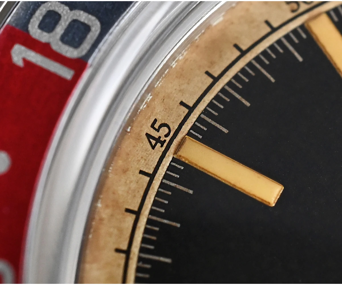 Please be aware that this watch is designed with an intentional aged look on the dial, hands, and bezel, reflecting a vintage style.